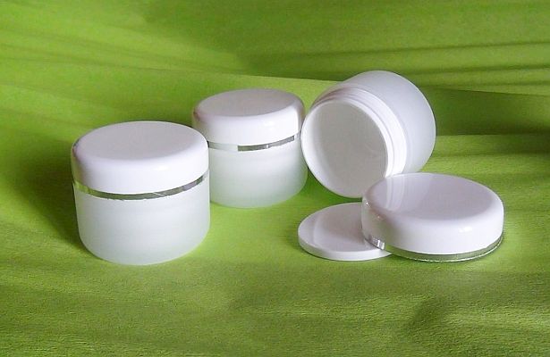 Kozmetični lonček, mlečno bel (peskan), z belim pokrovčkom s srebrnim prstanom, 30 ml, z dvojno steno – št. lončka 19B
