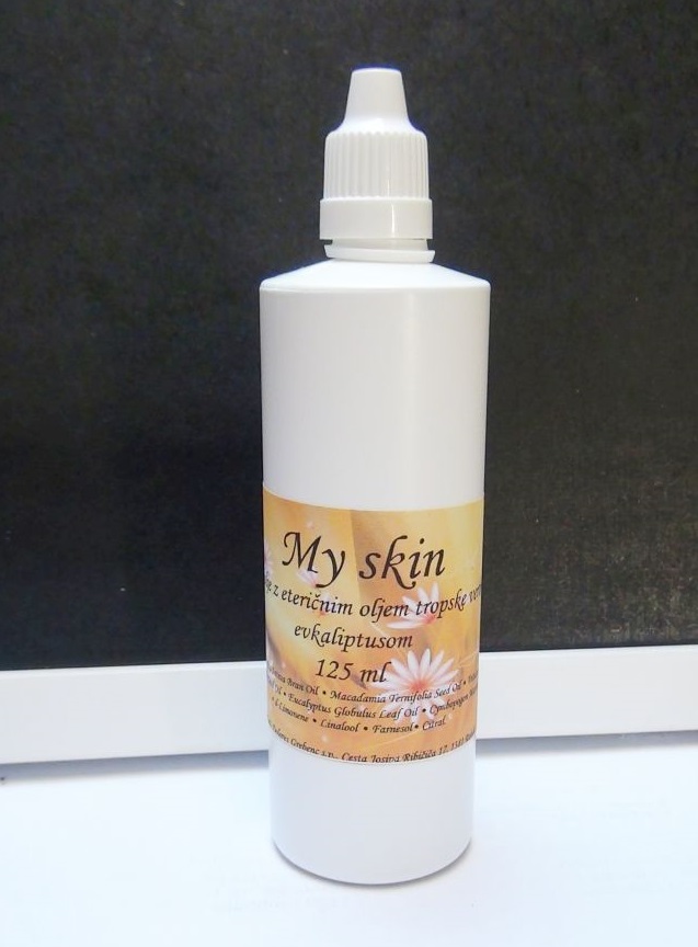 Masažno olje My skin – Vrhunsko masažno olje z vrhunskimi hladno stiskanimi olji in eteričnim oljem tropske verbene in evkalipta.