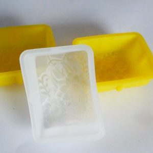 Silikonski kalup s štirimi odprtinami. Vsaka odprtina ima drugačen motiv: košara s cvetjem, ptici, riba in ptica z oljčno vejico.
