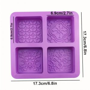 Silikonski kalup s štirimi odprtinami. Vsaka odprtina ima drugačen motiv: košara s cvetjem, ptici, riba in ptica z oljčno vejico.