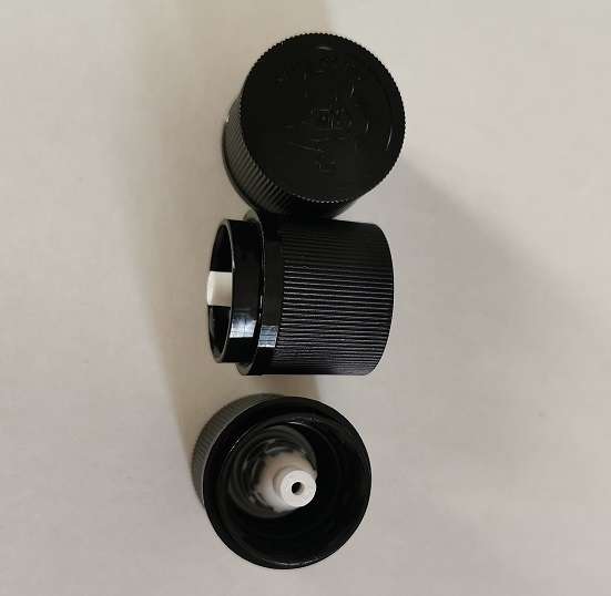 Varovalni zamašek s kapalnikom 18/410, črn, za stekleničke eteričnih olj. Zamašek je narejen iz kvalitetne plastike.